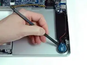 Используйте лопатку, чтобы поддеть батарею PRAM в её гнезде на сборке левого динамика.