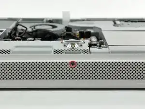 Поверните центральный винт с крестообразной головкой на нижней части iMac по часовой стрелке до тех пор, пока зажим задней панели не коснется края корпуса.