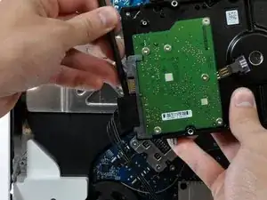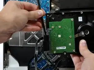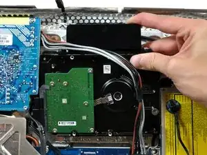 Поднимите жесткий диск со своих нижних штырей и вытяните его из задней крышки, следя за кабелями питания, которые могут застрять.