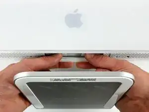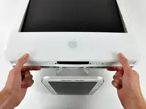 Чтобы приподнять переднюю рамку с iMac, одновременно:
