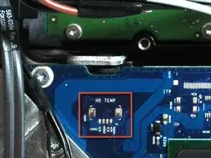 Оттяните разъём датчика температуры жёсткого диска от его гнезда на плате логики.