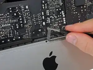 Плавно перемещайте карту к центру дисплея, разрезая оставшийся клей в верхнем правом углу iMac.