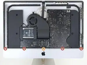Возможно, понадобится отогнуть клеевую ленту дисплея, расположенную на нижнем краю корпуса iMac, чтобы получить доступ к винтам.