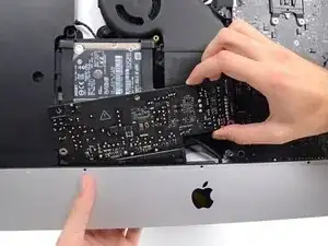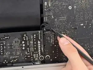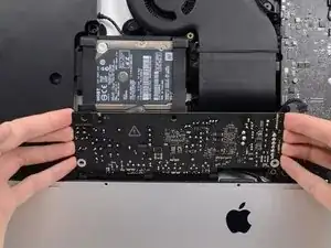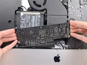 Не пытайтесь полностью вынуть блок питания из iMac — он всё ещё подключён к плате логики.