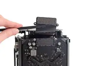 Используя пинцет, оттяните держатель кабеля вентилятора от узла вентилятора.