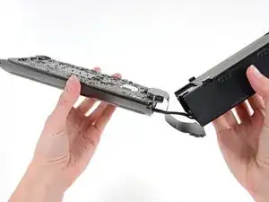 Аккуратно сдвиньте блок питания, чтобы освободить кабель сетевого разъема переменного тока из пластиковой защёлки.