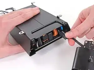 Снимите два винта T5 Torx длиной 3,6 мм с боков корпуса блока питания (по одному с каждой стороны).