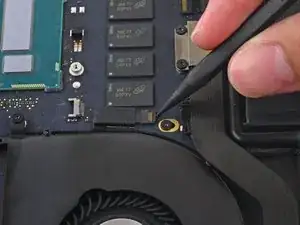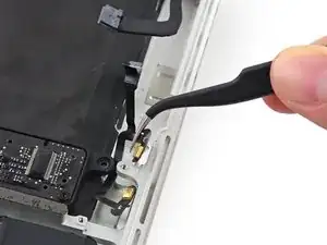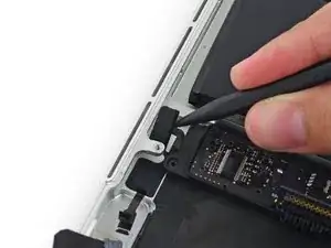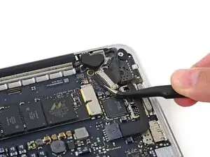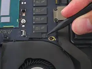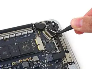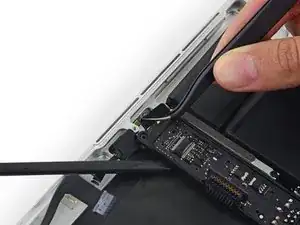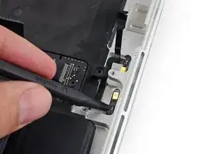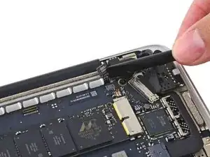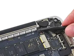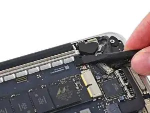 Используйте наконечник демонтажной лопатки, чтобы поднять разъём правого динамика вертикально вверх из его гнезда на логической плате.