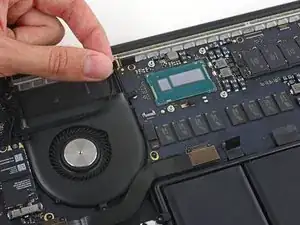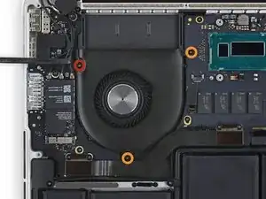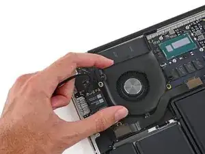 Поднимите край вентилятора, ближайший к петле дисплея, и снимите вентилятор с верхней части корпуса.