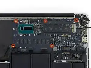 Снимите пять винтов T5 Torx длиной 3.5 мм, крепящих плату логики к верхнему корпусу.
