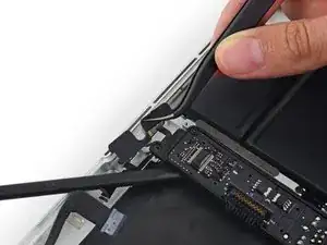 Используйте плоский конец лопатки, чтобы отсоединить кабель подсветки клавиатуры и отогнуть его вверх, чтобы он не мешал на плате логики.