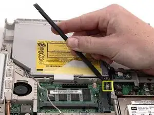 Используйте лопатку, чтобы поддеть антенну Bluetooth из паза между оптическим приводом и металлическим каркасом.
