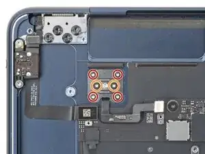 Используйте отвёртку Torx Plus 3IP, чтобы вывернуть шесть винтов длиной 1.5 мм, фиксирующих крышки межсоединения, трекпада и разъёмов MagSafe/Thunderbolt.
