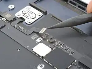 Используйте лопатку, чтобы приподнять и отключить защёлкивающиеся разъёмы кабелей дисплея и камеры.