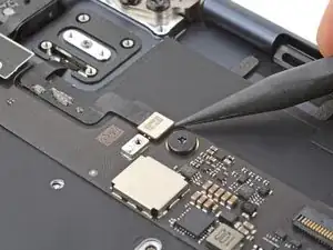 Используйте отвертку T3 Torx, чтобы вынуть два винта 1,5 мм, фиксирующие крышку кабеля трекпада.