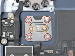 Используйте отвёртку Torx T3, чтобы выкрутить шесть винтов, фиксирующих сенсор Touch ID и его кронштейн: