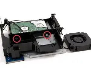 Используя отвертку #1 Phillips, удалите два винта, крепящих правую сторону жесткого диска к пластиковой раме. Вам потребуется наклонить отвертку вниз, чтобы получить доступ к нижнему правому винту. Обязательно прикладывайте устойчивую силу к винтам и поворачивайте медленно, чтобы не сорвать их.