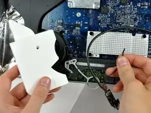 Потяните разъём динамика в направлении верхнего края iMac, чтобы отсоединить его от логической платы.