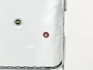 Удалите винт T10 Torx длиной 30 мм, фиксирующий левый динамик к задней крышке.