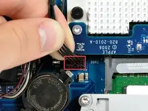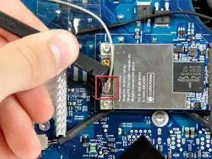 Используйте плоский конец лопатки, чтобы поддеть разъем антенны AirPort Extreme и приподнять его с платы AirPort Extreme.