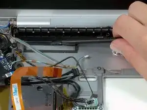 Аккуратно отклейте черную клейкую ленту, закрепляющую кабель динамика вдоль заднего края нижней части корпуса.