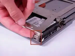 Поверните компьютер так, чтобы пластиковая защёлка в верхнем левом углу нижней крышки была обращена к вам. Освободите защёлку, приподняв фиксатор. Возможно, потребуется подвинуть жёсткий диск, чтобы извлечь фиксатор.
