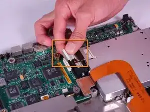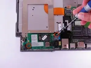 Используйте отвёртку T8 с крестообразным шлицем, чтобы вывернуть винт длиной 6,8 мм, расположенный выше и справа от разъёма модема.