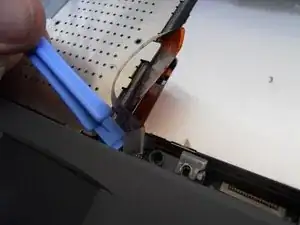 С помощью лопатки поднимите пластиковые защелки на дисководе, удерживающие шлейф крепления к разъему шлейфа.