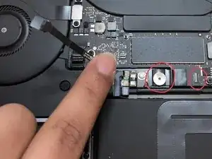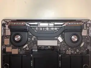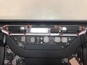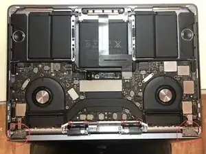 Чтобы снять антенный брусок, начните с удаления 12 винтов, расположенных над вентиляционными отверстиями левого/правого радиатора, используя бит Pentalobe-2 (P2).
