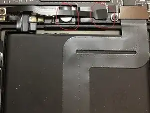 сняв нижний корпус, начните с отключения батареи. это делается сначала путем отведения ленточного кабеля в сторону от винта, фиксирующего контакт батареи. После отвинчивания поднимите защёлку, чтобы прервать контакт с батареей.