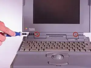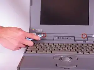 Используйте пластиковый инструмент для открытия, чтобы удалить два маленьких пластиковых заглушки, расположенные на корпусе дисплея прямо под дисплеем.