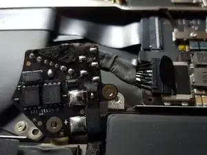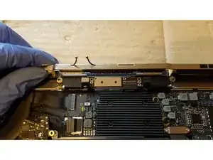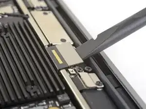 Используйте торкс‑отвёртку T3, чтобы выкрутить два винта 1.1 мм, фиксирующие кронштейны гибкого кабеля.