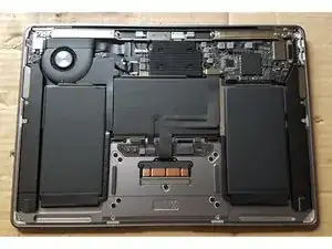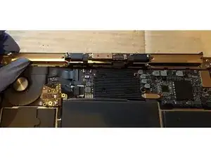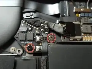 Используйте торкс‑отвёртку T3, чтобы выкрутить два винта 2.3 мм, крепящих плату аккумулятора: