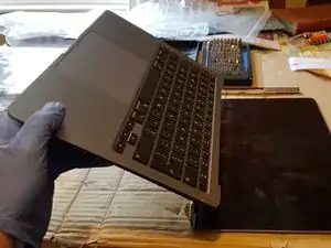 Держа MacBook всё ещё экраном вниз, аккуратно поднимите верхнюю часть корпуса, чтобы открыть MacBook максимально широко.