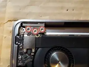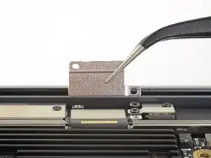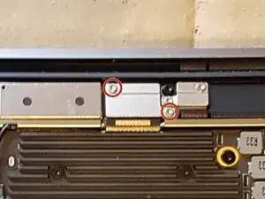 Используйте торкс‑отвёртку T3, чтобы выкрутить два винта 1.3 мм, фиксирующие кронштейн разъёма кабеля дисплея.
