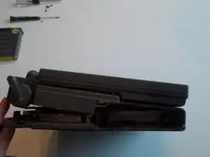 ОСТОРОЖНО поднимите заднюю часть экрана и клавиатурного блока (верхняя часть компьютера) и МЯГКО отодвиньте передние левые и правые углы от нижнего блока до того, как вы услышите щелчок. Затем МЕДЛЕННО поднимите верхнюю часть и извлеките кабель соединения (большой, несколько хрупкий кабель, соединяющий две половины) из его разъема в дочерней плате.