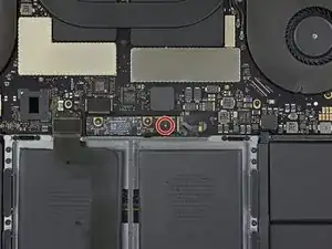 Используйте отвертку Torx T5, чтобы выкрутить блинный винт 3,7 мм, фиксирующий разъём питания аккумулятора.