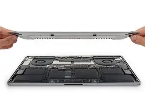 Потяните нижнюю крышку сильно к передней части MacBook (в сторону от петель), чтобы отделить последние защёлки, удерживающие крышку.