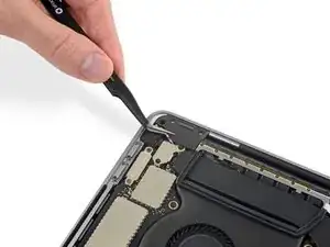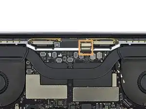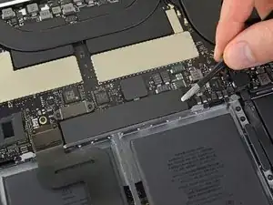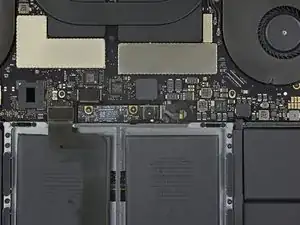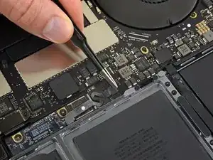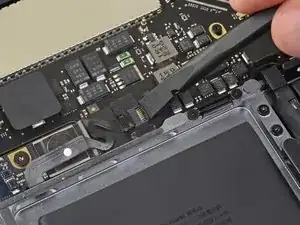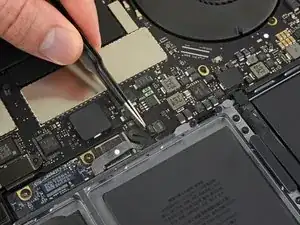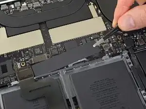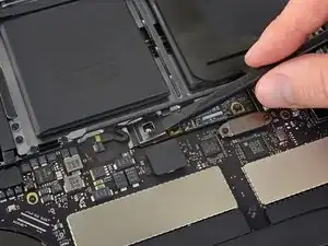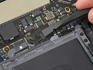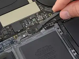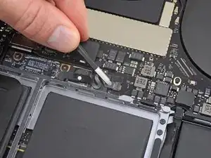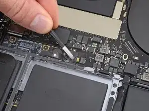 Отклейте и снимите большую прямоугольную крышку платы аккумулятора на краю логической платы, ближайшем к аккумулятору.