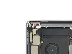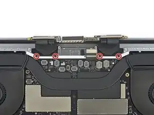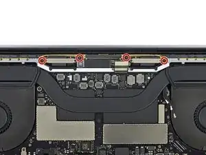 Используйте отвертку Torx T3, чтобы выкрутить четыре винта 3,9 мм, фиксирующие пружины крышки кабеля дисплея.