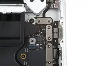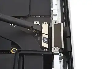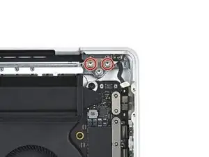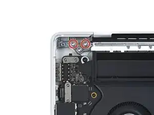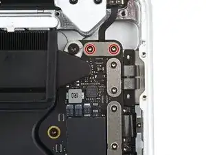 Используйте отвертку Torx Plus 3IP, чтобы вынуть два винта длиной 2,1 мм, фиксирующие кронштейн кабеля трекпада к логической плате.