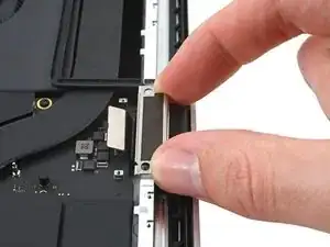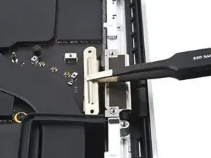 С помощью пинцета или пальцами снимите кронштейн кабеля трекпада.