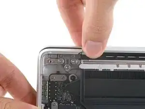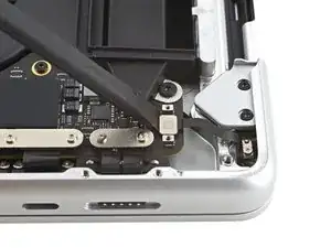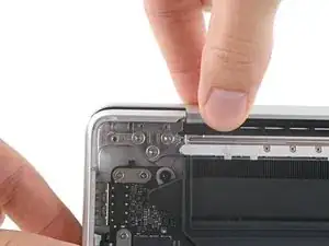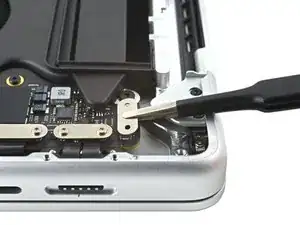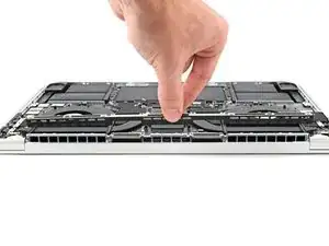 По заднему краю MacBook находятся скользящие зажимы, дополнительно фиксирующие нижнюю крышку. Для отделения этих зажимов может потребоваться значительное усилие — подумайте о перчатках, чтобы защитить руки от острых краёв нижней крышки.