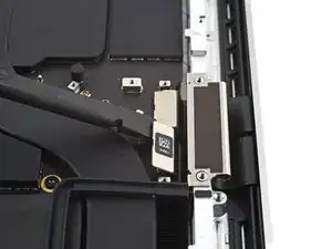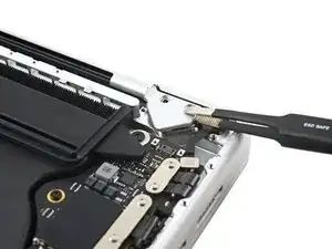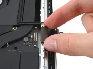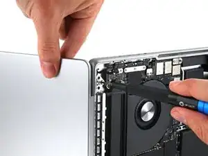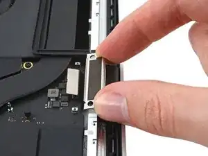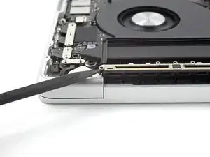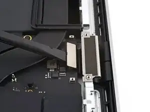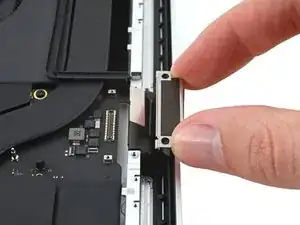 Используйте плоский конец лопаточки, чтобы приподнять и отключить пресс‑разъём кабеля трекпада от логической платы.
