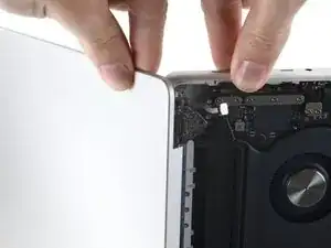Установите её на место и совместите скользящие зажимы рядом с шарниром экрана. Надавите и сдвиньте крышку в сторону шарнира. Крышка перестанет сдвигаться, когда зажимы встанут на место.