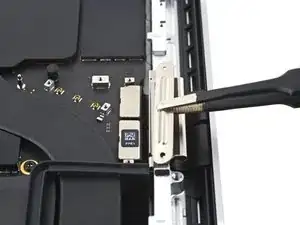 Используйте плоский конец лопатки, чтобы приподнять разъём питания аккумулятора от платы аккумулятора, отключив аккумулятор.