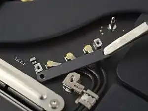 Используйте лопатку, чтобы аккуратно приподнять фиксирующую защёлку на ZIF-разъёме кабеля данных платы аккумулятора.