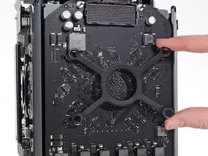 Снимите два защитных винта Torx T8 длиной 6,6 мм, крепящие GPU к Mac Pro.