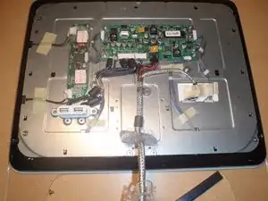 Плата инвертора CCFL является меньшей из двух плат с двумя проводами и шлейфом, выходящими из нее.