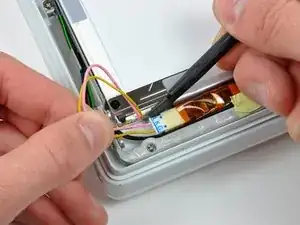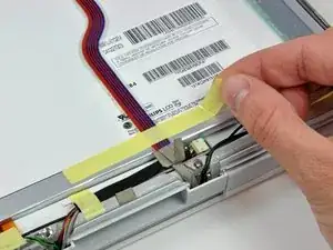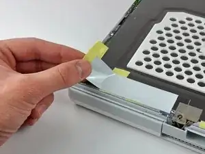 Снимите небольшие кусочки жёлтой клейкой ленты, фиксирующие тонкую металлическую крышку ЖК к дисплею.